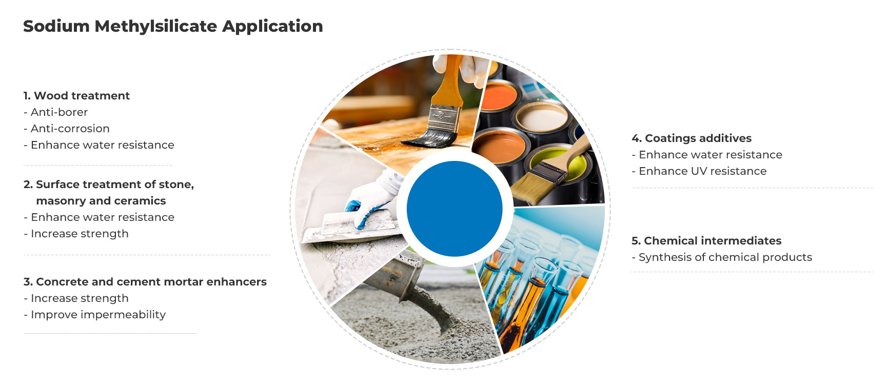 Với những đặc tính tuyệt vời này, natri methyl silicat có triển vọng ứng dụng rộng rãi trong nhiều lĩnh vực. Trong lĩnh vực xây dựng, nó có thể được sử dụng để chống thấm các bức tường bên ngoài, mái nhà, tầng hầm và các bộ phận khác của tòa nhà, ngăn chặn rò rỉ nước mưa một cách hiệu quả và bảo vệ kết cấu tòa nhà. Lấy một tòa nhà dân cư cao tầng làm ví dụ, sau khi sử dụng natri methyl silicat để chống thấm các bức tường bên ngoài, sau nhiều năm mưa lớn, tường không bị rò rỉ và tỷ lệ khiếu nại của cư dân giảm xuống đáng kể. Trong việc cải tạo các khu dân cư cũ, natri methyl silicat được sử dụng để chống thấm mái nhà, giúp kéo dài đáng kể tuổi thọ của mái nhà.